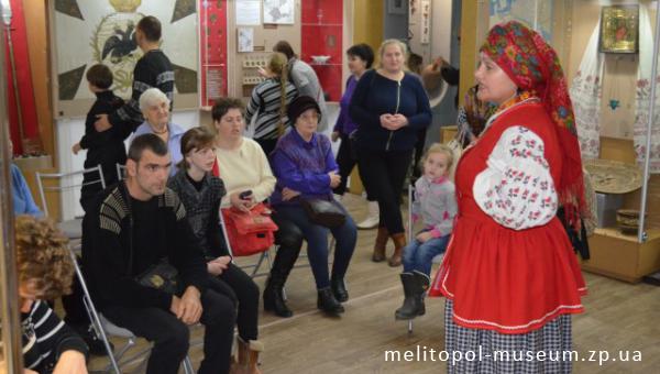 В залі «Наш край з XV століття до 1914 року» гостинна господиня Тетяна Шевченко-Чепелєва на лише розповіла, а й наочно показала, якими речами користувались в побуті мешканці Мелітопольщини в минулому столітті, адже на відвідувачі чекав інтерактивний фешн-показ з «чарівної» музейної скрині, моделями якого стали вони самі!