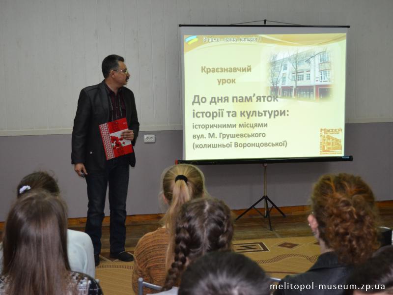 Сам же Міжнародний день пам’ятників та історичних місць встановлений Асамблеєю Міжнародної ради з питань охорони пам’ятників та визначних місць у 1982 році. Його мета - привернути увагу до проблеми збереження об’єктів культурної спадщини, які є сукупністю успадкованих людством від попередніх поколінь ку-льтурних цінностей. Видом культурної спадщини є обєкти архітектури та місто-будування. Цього разу ми вирішили зупинитися на об’єктах архітектури, зосере-джених на одній із центральних вулиць міста Мелітополя – вул. М. Грушевського.