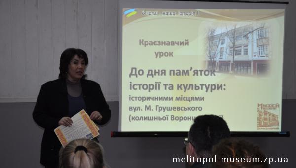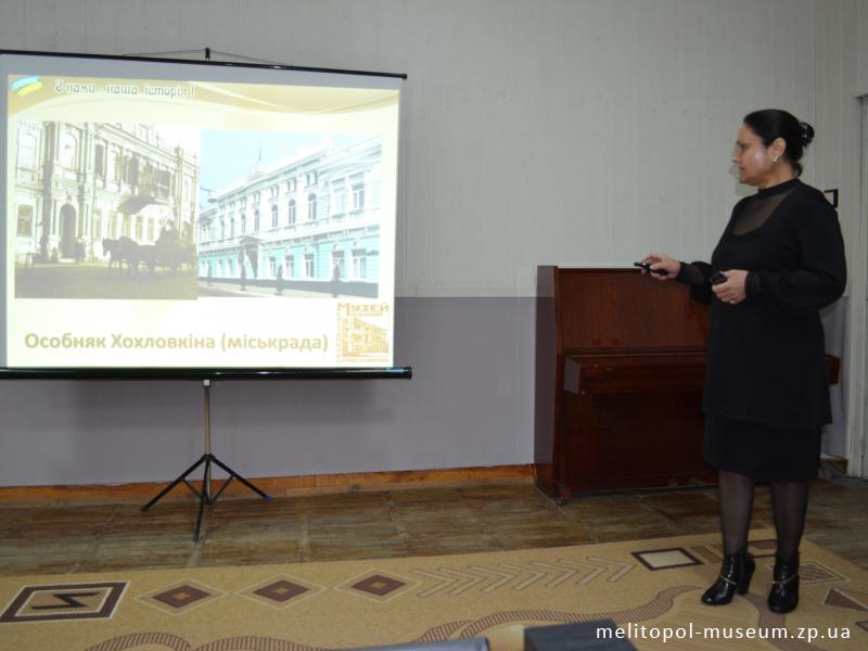 Гості також переглянуть фільм «По улицам родного города». Один із творців цього фільму, наш експерт з дореволюційної архітектури м. Мелітополя н.с. музею Т.Т. Шевченко-Чепелєва, прокоментує фільм і відповість на питання: які ж архітектурні пам’ятки вулиці М. Грушевського мають найбільше значення, який їх сучасний стан, і які перспективи їх збереження та відновлення?