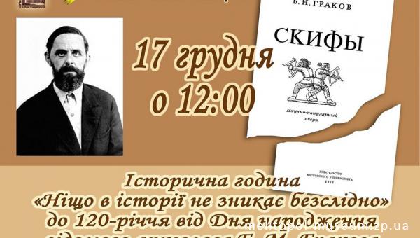 17 грудня 2019 року о 12:00 в Мелітопольському міському краєзнавчому музеї відбудеться історична година «Ніщо в історії не зникає безслідно» до 120-річчя від Дня народження видатного археологія Бориса Миколайовича Гракова, на яку запрошені учні 9 класу Ліцею №5.