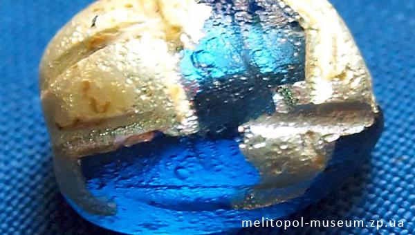 Поява скляної намистини-скарабея в степу під Мелітополем, як відзначав дослідник, свідчить про контакти місцевого катакомбного населення з Кавказом, Близьким Сходом та Єгиптом. (Скло (паста), ХVІІІ-ХVІІ ст. до н.е.).