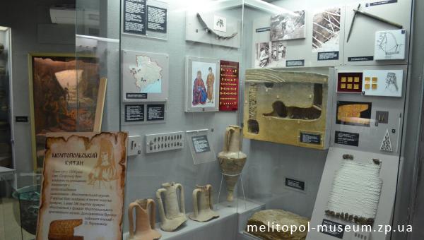 Мелітопольський курган був пограбований ще в давнину. Але, не дивлячись на це, вченим вдалося знайти немало цінних речей. В чоловічому похованні був виявлений потайний відділ, не знайдений крадіями. В ньому лежали залишки головного убору, від якого збереглися лише нашивні золоті бляшки із сценами з життя скіфів, а також золота обкладка горита (футляр для лука та стріл), на якій зображені сцени з давньогрецького епосу про Троянську війну. В жіночому похованні було знайдено велику кількість золотих блях із зображенням тварин, рослин і давньогрецьких богів, які нашивалися на одяг. В експозиції представлені їх муляжі, але традиційно на День міста Мелітополя в краєзнавчому музеї відбувається одноденна виставка оригінального скіфського золота, яке зберігається в наших фондах. По підрахунках вчених, загальна вага золотих предметів, які знайшли під час розкопок Мелітопольського кургану, склала 2 кг.