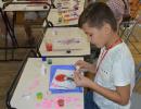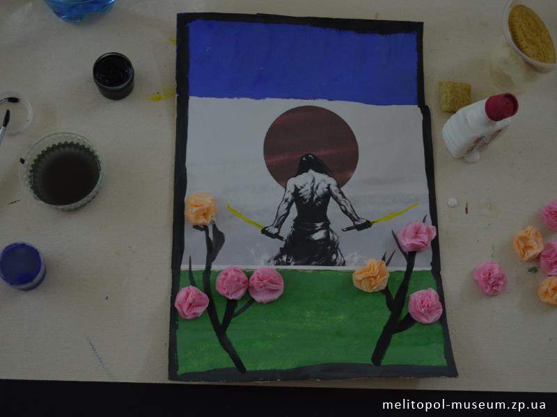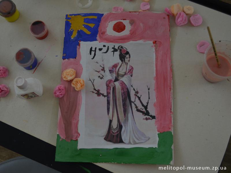 Дуже творчим та надзвичайно яскравим видався майстер-клас, який також був присвячений японській тематиці. Діти прикрашали картину японською квіткою – сакурою, за допомогою серветок. Крім того, підписали свої роботи ієрогліфами, які позначають їхні імена! Результатом були дуже задоволені, а свої емоції відобразили на фото.