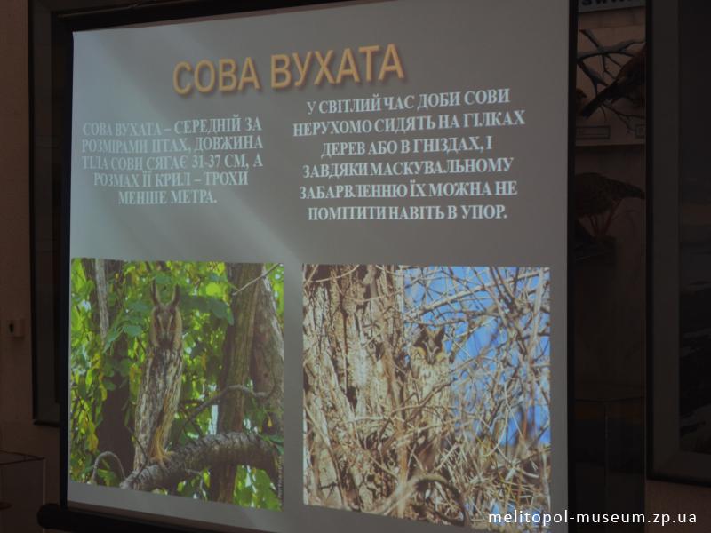 Птахи – це окраса природи. За птахами дуже цікаво спостерігати. Є в нашому краї нічні вартові, нічні мисливці, які подорожують в світ загадкової ночі. Це – сови. На території Мелітопольщини зустрічаються вухата сова, сплюшка, сіра сова та хатній сич. Саме про них йшла розмова під час зустрічі.