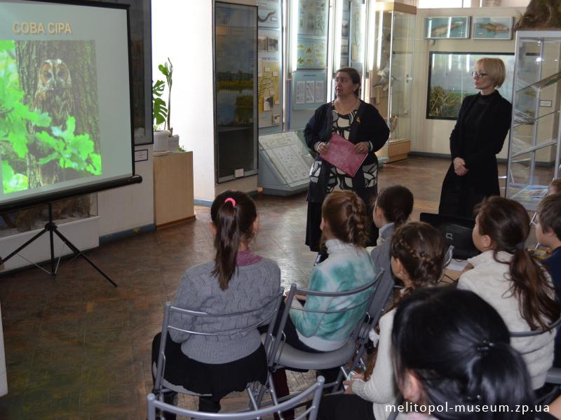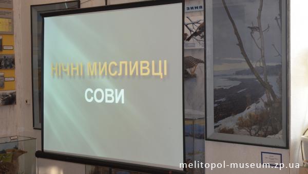 24 січня 2018 року о 9-00 та 10-30 в Мелітопольському міському краєзнавчому музеї пройшла тематична екологічна бесіда «Сови. Нічні мисливці…». До музею завітали учні 2 «Г» та 4 «Г» класів навчально-виховного комплексу № 16 м.Мелітополя.